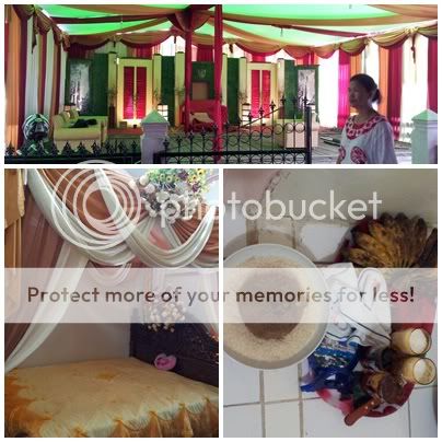 Gambar di atas itu pelaminan, kamar pengantin dan sesajen? yang disiapakan oleh mak pengantinnya (tukang rias). Jadi, tukang riasnya meminta aku menyiapkan 9 jenis benda untuk disimpan saat dia merias. Kemaren seh aku nyiapin beras, kelapa, pisang, garam, kopi, asam, pisau,Β  cermin dan handuk putih. Sambil dibacain doa-doa gitu deh.