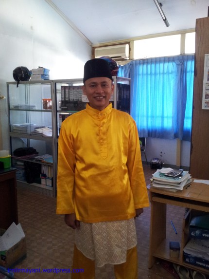 Sering lihat gak? Rasanya sering deh yak. Pakaian ini sering dipake kalau acara-acara resmi di Malaysia sono. Yak, gak tahu juga kalau pakaian ini yang mana yang duluan yang punya. Yang pasti setahu aku ada 3 negara yang pake pakaian seperti ini yaitu Indonesia (yang diwakili oleh melayu) Malaysia, dan Brunei. Pakaiannya terdiri dari baju yang mirip koko gitu terbuat dari bahan satin (aslinya, tapi sekarang udah banyak modifnya juga seh) berwarna kuning emas (juga yang aslinya karena menurut orang melayu kuning emas itu warna kerajaan) lalu dipadukan dengan celana panjang dan sarung yang dililitkan di pinggang dengan panjangnya sampe ke lutut (khasnya sebenarnya kain corak insang (kain khas pontianak) seh bukan seperti kain difoto atas).