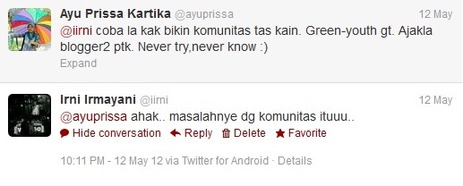 Jadi berfikir apa aku membangun komunitasnya dari dunia maya aja yak? Tapi tetep implementasinya harus di dunia nyata dong kan? Tapi males berhubungan dengan banyak orang. Aaaahhhh.. gak selesai-selesai deh kalau masalahnya emang dari diri aku sendiri.