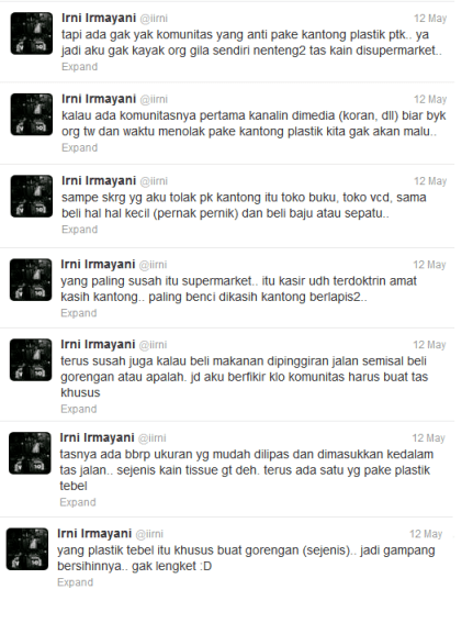 Beberapa kali aku juga ngetwit tentang sampah dan kantong plastik yang menghantui aku banget, benci tapi gak bisa dibasmi gitu. Bahkan aku beberapa kali (lebih tepatnya sering ya) harus tetap menggunakan kantong plastik.