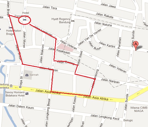 Awalnya masih OK lah yak, karena dari hotel aku ke jalan Braga itu cuma 200an meter lah, dan Jalan Braga sendiri cuma lurus aja kan? (gak yakin sendiri). Nah, pas jalan Braga sudah abis baru jadi masalah. Mau pulang kok alang-alang baru jalan bentar. Mau jalan terus tapi gak tahu jalan. Tapi bukan namanya Niee kalau gak sok ngerti jalan. Daripada bosen, ya mending terus aja