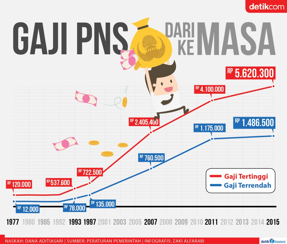 Walaupun cuma sampe tahun 2015 tapi udah menggambarkan kok gajinya. Soalnya selama pemerintahan jokowi (tahun 2016-2017) gaji PNS gak naek-naek kawan! 😥 *nangisdipojokankolongmejakantor*