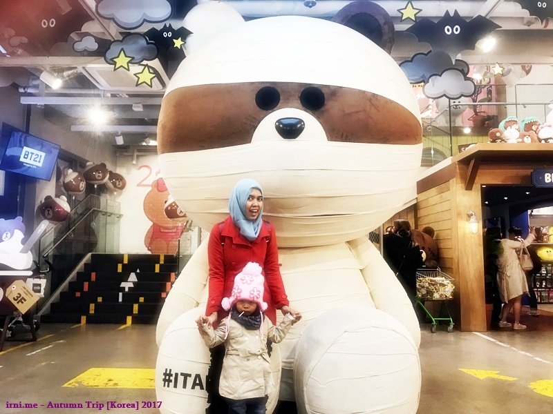 Udah puas makan kita ke luar restoran ke atas stasiun subway. Tujuan kita adalah ke Myeongdong. Gak, aku gak bakalan puas belanja kok, karena aku emang gak hobi belanja seh yak 😛 tapi kita niatin buat ke Line Store untuk nyenengin si K karena gagal ke teddy bear house. Eh ternyata Line Store di Itaewon juga ada loh. Dan dari gedungnya kelihatan lebih gede lagi. Jadilah kita ajakin si K buat masuk di sana aja. Etapi anaknya gak mau masuk dong, coz di depannya ada kayak parade karakter Line yang serem-serem gitu. Akhirnya kita cuma foto bentar, langsung cabut ke Myeong Dong.
