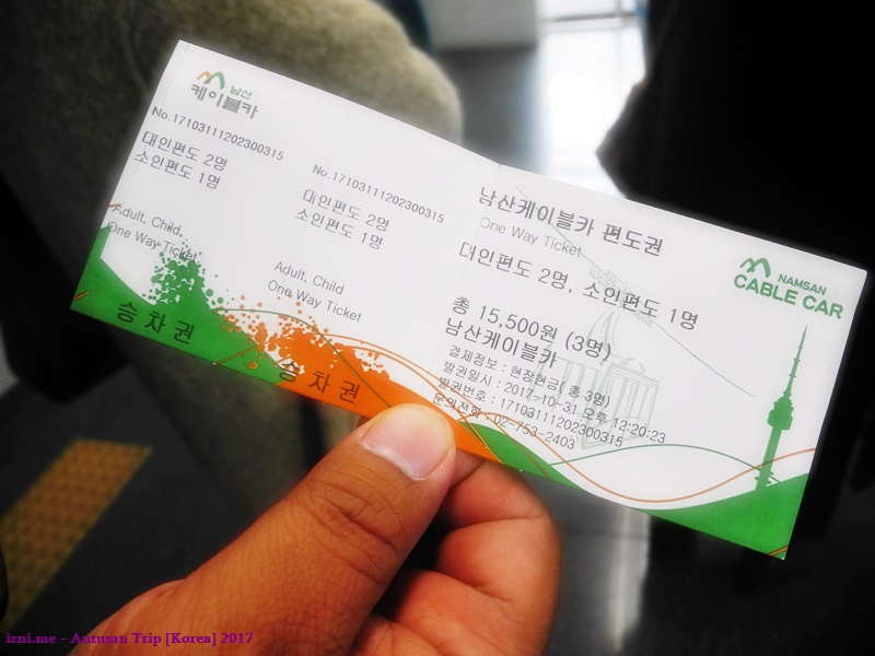 DSCN3273 November 27, 2017 Return to: Autumn Trip [Korea] : N-Seoul Tower, Itaewon dan Myeongdong StreetFull resolution (800 × 600) Image navigation Previous Image Next Image Tiket naek kereta gantung one-way. Karena baliknya kita rencananya bakalan naek bus yang langsung menuju Itaewon