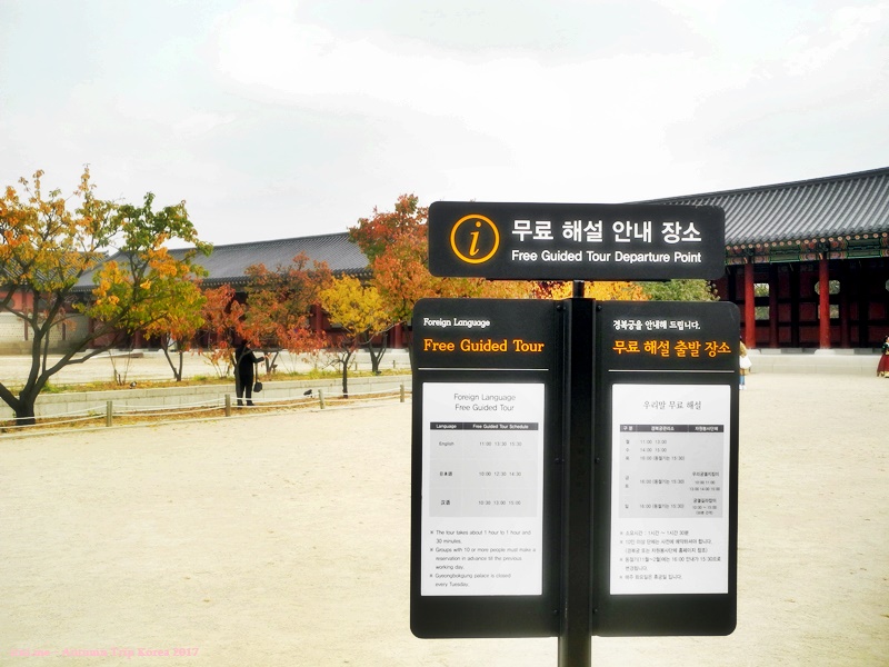DSCN3441 January 2, 2018 Return to: Autumn Trip [Korea] : Gyeongbokgung Palace dan Cheonggyecheon StreamFull resolution (800 × 600) Image navigation Previous Image Next Image Papan informasi di Gyeongbokgung Palace, ada jadwal tour berbahasa Indonesia juga loh. Tapi minimum rombongannya 10 orang