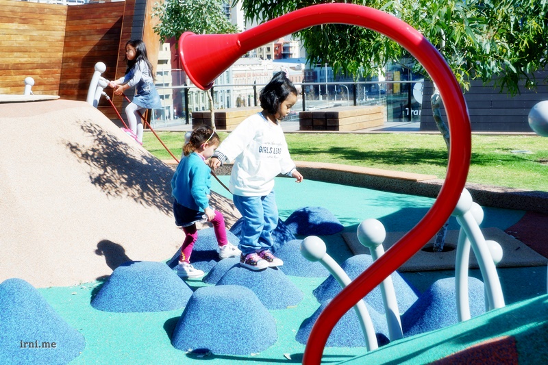 BTW, aku suka banget dengan Perth dan Sydney ini karena di mana-mana banyak sekali menyediakan playground untuk anak-anak main seperti ini. Gak gede seh, tapi banyak dan tertata dengan rapi. Bahkan dibeberapa tempat ada jadwal maintenancenya yang berarti tempatnya sangat dirawat oleh Pemerintah. Jadi kalau main ke Aussie gak perlu harus cari indoor playground yang mihil kayak di Singapore untuk menyenangkan si anak balita. Cukup ke taman aja dianya udah senang. Dan selama bermain ini minimal si K melatih komunikasi berbahasa Inggrisnya juga seh yak. Dan aku lihat dia sudah amat lancar dan sama sekali gak kesulitan untuk berkomunikasi dengan anak-anak lainnya. PR juga buat emaknya untuk lebih meningkatkan bahasa Inggrisnya ntar malah ketinggalan sama anak sendiri 😛