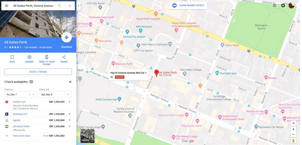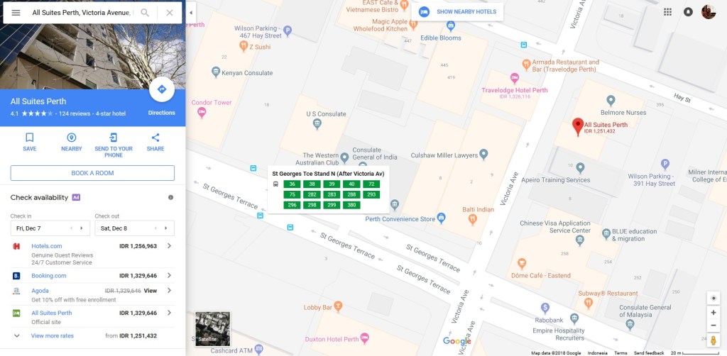 Kalau kita lihat di peta, All Suites Perth ini dikelilingan oleh beberapa stasiun bus. Dari bandara Perth kita bisa naik Bus 380 akan langsung jalan dan bisa berhenti di St Georges Tce Stand (After Victoria Av). Dari stasiun, kita tinggal jalan kaki 200 meter ke hotel. Ini deket banget kok, jadi gampang untuk didatangi. Kalau mau pulang ke bandara, kita tinggal nunggu bis diarah sebaliknya di St george Tce Stand B E F (After Irwin St) dan kita juga bisa langsung sampai ke bandara tanpa pindah-pindah bus lagi.