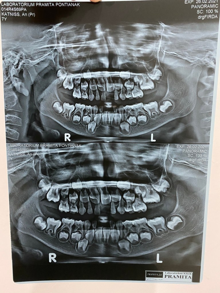 Setelah giginya dicabut, dokter giginya menyarankan untuk rontgen mulutnya. Mau lihat bagaimana perkembangan bakal-bakal gigi permanennya nanti. Kita ya ikut aja karena penasaran juga dengan gigi dia di masa yang akan datang. Dan ini dia hasilnya.