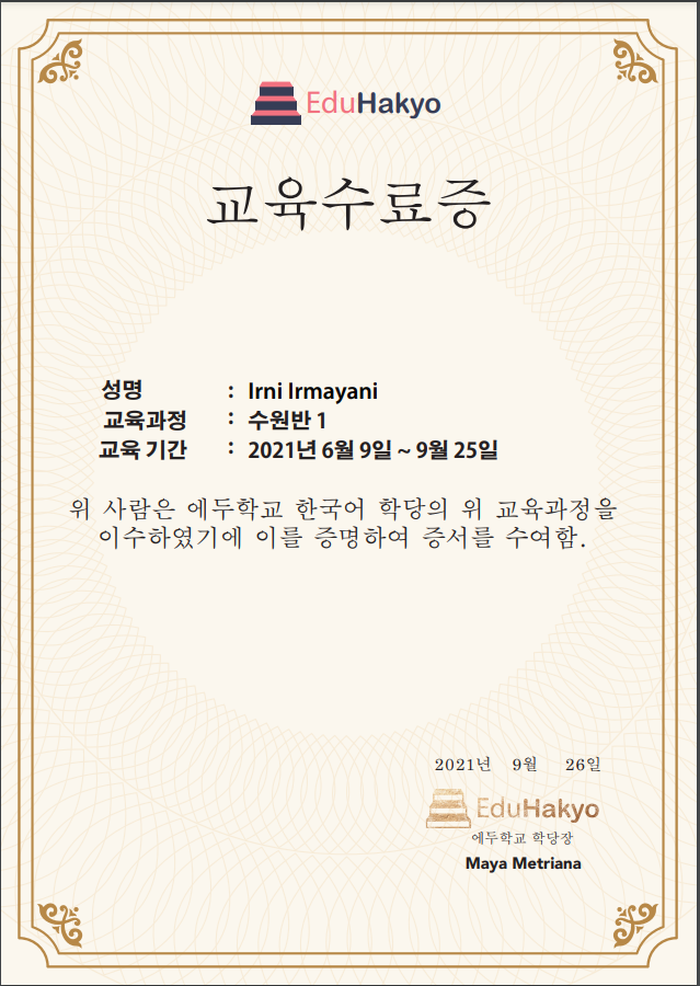Pas banget waktu lebaran aku ada lihat tempat les bahasa korea gitu yang online via zoom. Namanya EdyHakyo. Tingkat pertama itu belajar Hangeulnya dulu, itu tuh Alphabetnya bahasa korea. Cuma 4 kali pertemuan selama 2 minggu. Dan pas belajar hangeul kok ya seru dan mudah! Aku sesekali baca udah hapal dengan huruf-hurufnya dan aku jadi bisa baca tulisan korea! Seneng bangetkan!