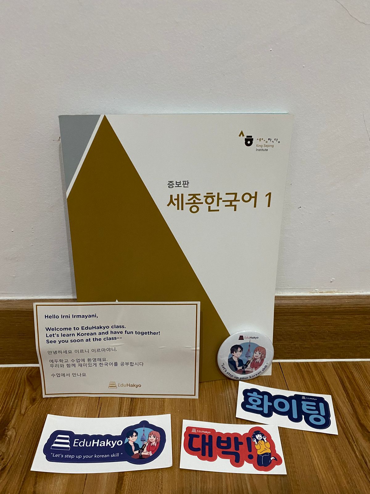 Karena merasa oh, bisa neh aku belajar bahasa korea dengan mudah. Jadilah aku langsung ambil kelas selanjutnya yaitu kelas Basic 1 di tempat yang sama. Sebelum kelas dimulai, aku dikirimkan paket buku untuk belajarnya seperti gambar di bawah ini.