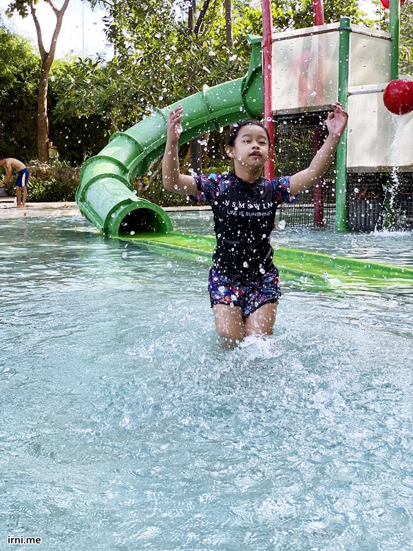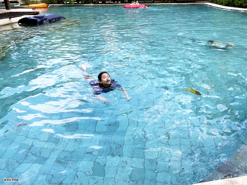 Selain kamar dan viewnya yang ok, hotel ini juga lengkap banget seh dan katanya dia ini adalah hotel dengan kolam berenang terbesar (atau terpanjang) di Bali (?) Tapi dari yang aku lihat seh emang kolam renangnya ini luas banget. Dari ujung ada kolam renang khusus untuk anak-anak yang ada seluncurannya. Terus ada kolam renang yang buat leyeh-leyeh sambil pake pelampung bantal. Terus ada juga kolam renang yang serius gitu buat yang beneran mau renang laps bolak balik, sampai ada kolam kecil yang isinya air mancur untuk anak balita main. Si K sendiri suka main di kolam leyeh-leyeh karena ukurannya pas yaitu 120 cm dan dia sendiri sekarang tingginya udah 140 cm lebih jadi udah bisa berdiri sambil pegang bantalnya.