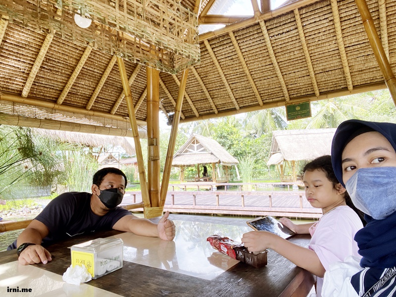 Yang aku suka dari restoran ini tempatnya seh yak. Jadi tempat makannya itu ada saung-saungnya. Di tengah restoran ada kolam gede yang isinya ikan yang bisa kita kasih makan. Yang mana kalau udah ngasih makan ikan ini si K paling seneng dah. Terus disekeliling saungnya itu masih hamparan sawah dan ada aliran sungai kecil gitu. Bener bener restorannya cocok buat Healing mah kata genZ zaman sekarang 😛
