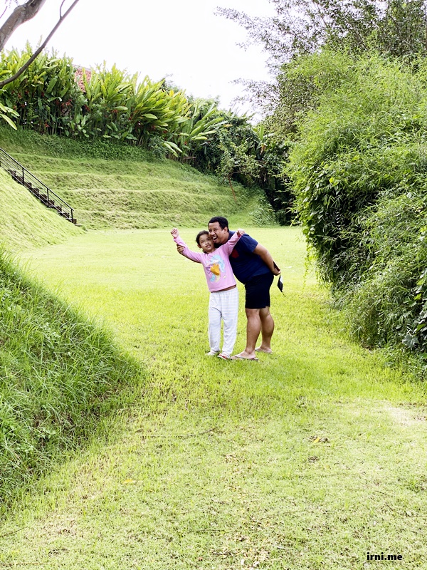 Hotelnya gak gede seh dan pemandangannya menurut aku B aja. Makanan untuk sarapannya juga sedikit jadi termasuk yang standar deh menurut aku hotelnya. Cuma dia karena di Ubud dekat dengan sungai kecil gitu dan kita bisa jalan-jalan disekitaran sungainya. Kayaknya emang Ubud ini banyak sungai di mana-mana ya, jadi seru gitu suasananya. Selain sungai ada juga hamparan rumput kecil gitu di dekat parkiran mobil. Si K suka banget dengan hamparan rumput ini karena bentuknya berbukit-bukit dan dia suka manjatin bukit kecilnya.