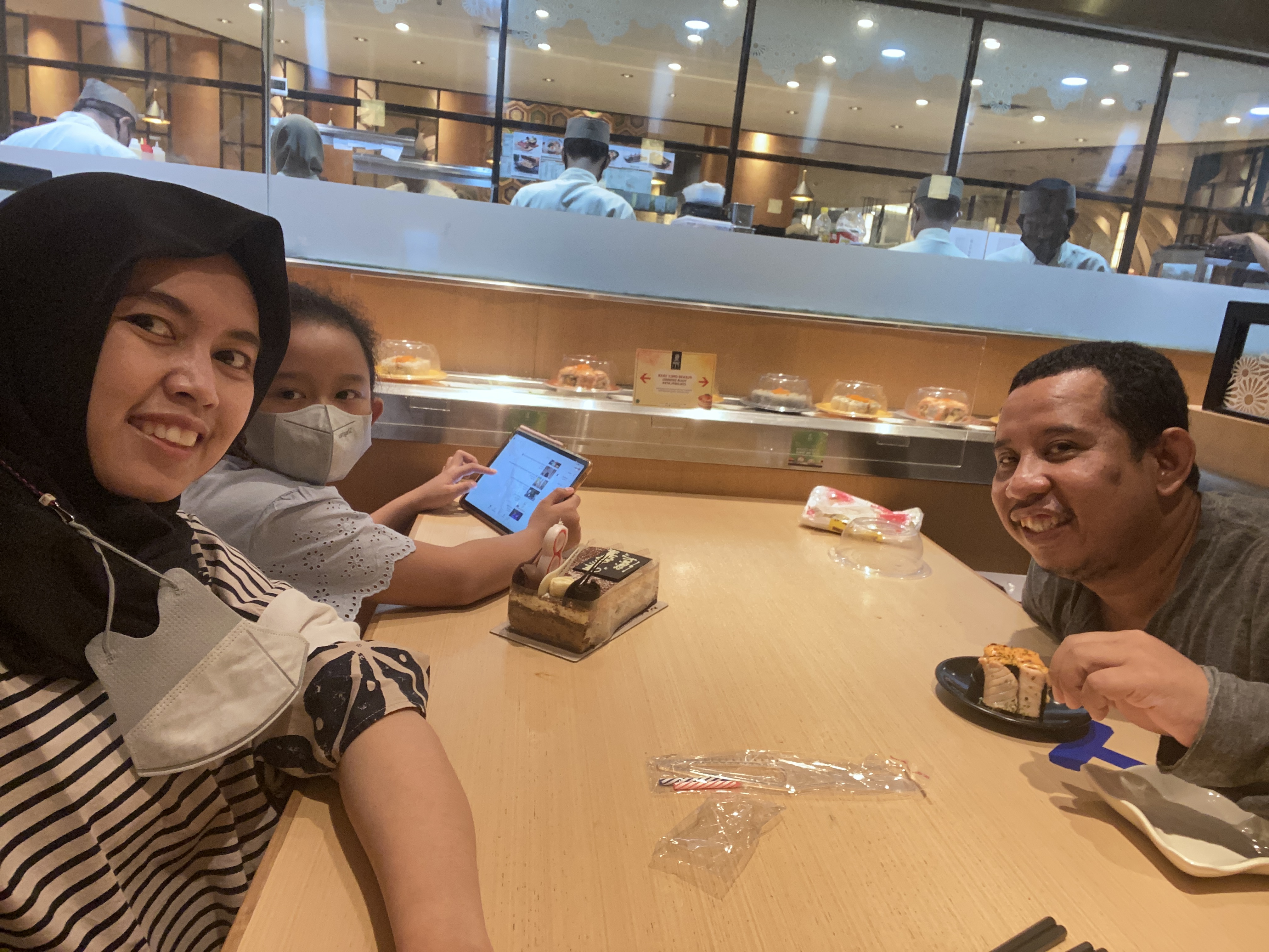 Hari terakhir si Jakarta, Minggu adalah hari ulang tahun si K. Jadi di hotel kita ngerayain dulu buat tiup-tiup lilin. Siangnya kita makan di Sushi Tei. Di sushi Tei, karena si K ulang tahun, kita jadi dapat sushi tambahan dan lilin buat ditiup.